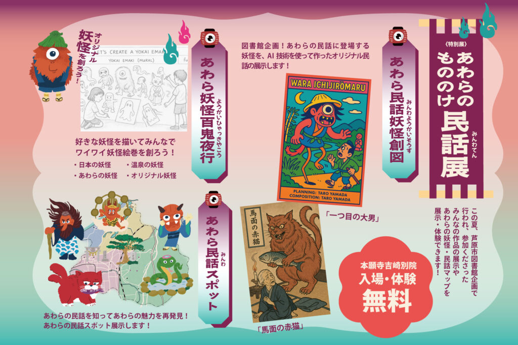 この夏、芦原市図書館企画で行われ、参加くださったみんなの作品の展示やあわらの妖怪・民話マップを展示・体験できます!